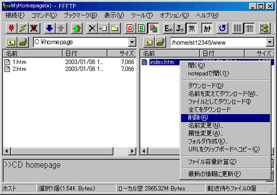 サーバに接続した後、画面向かって右側のサーバー内のファイルを右クリックし削除を選択すると、一度サーバーへ転送したファイルを削除することができます。