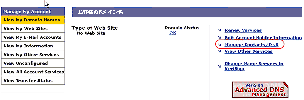 - Manage Contacts/DNS をクリックします