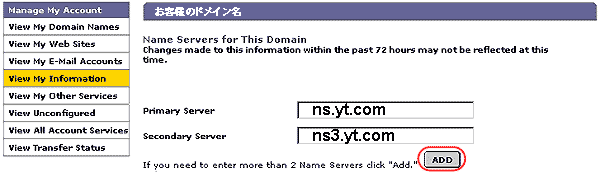 - Name Servers for This Domain に、下記の情報を入力しADDを押します。